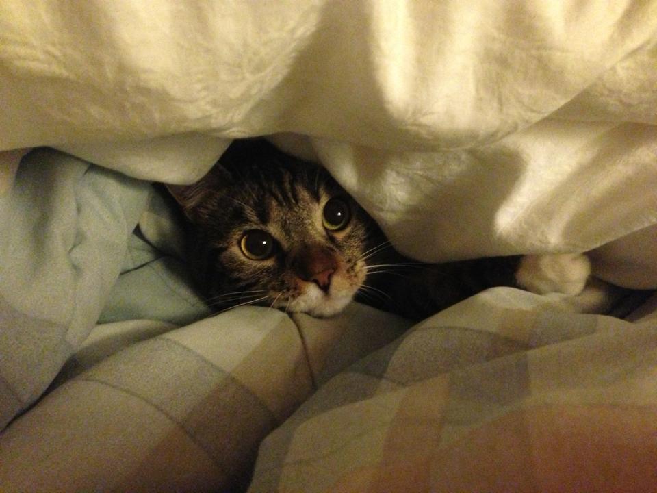 So here is my little girl peering out from the blankets. Two years ago I adopted her from the SPCA here in San Francisco.